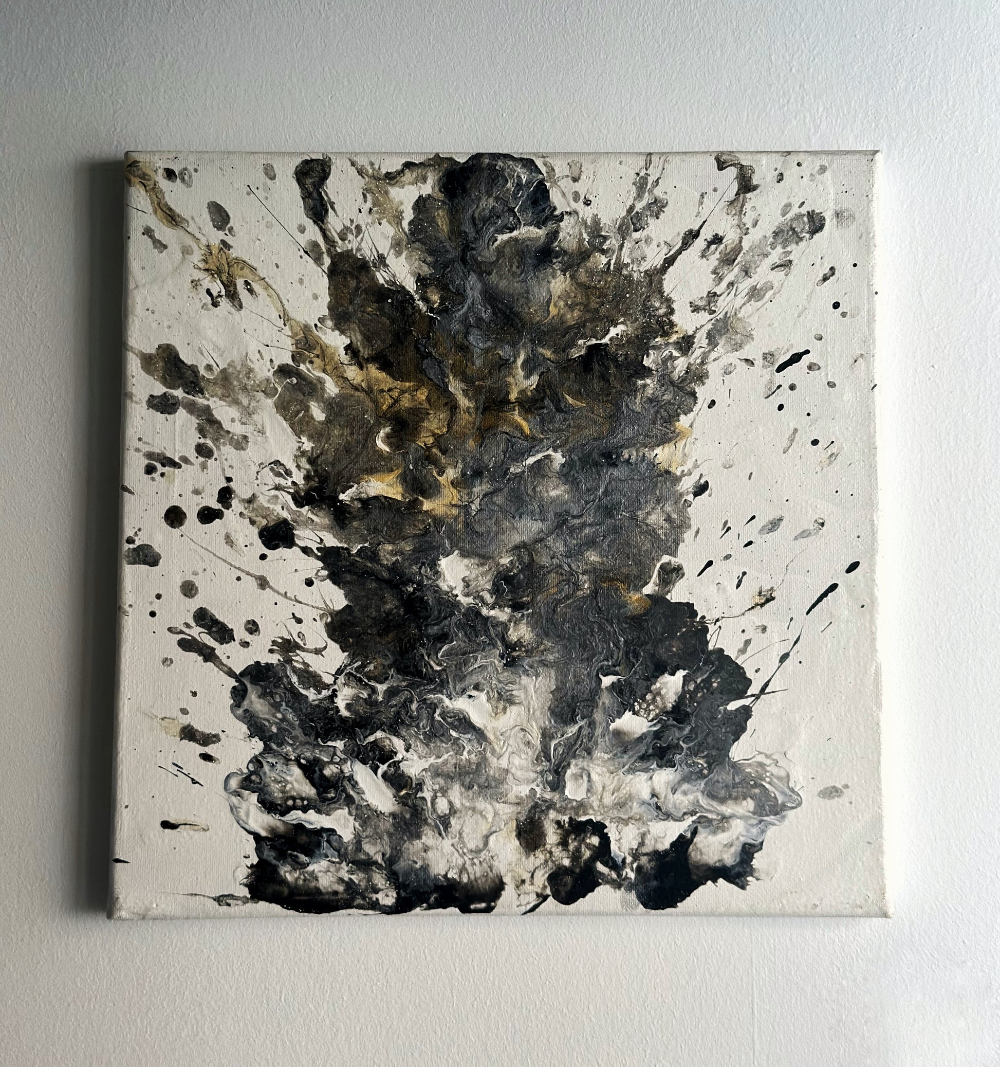 Implosion is a visual representation of pent-up energy, of the moment when everything collapses toward its core to be reborn from within. The mix of white, black, and gold merges into a whirlwind of emotions that evoke both destruction and rebirth.